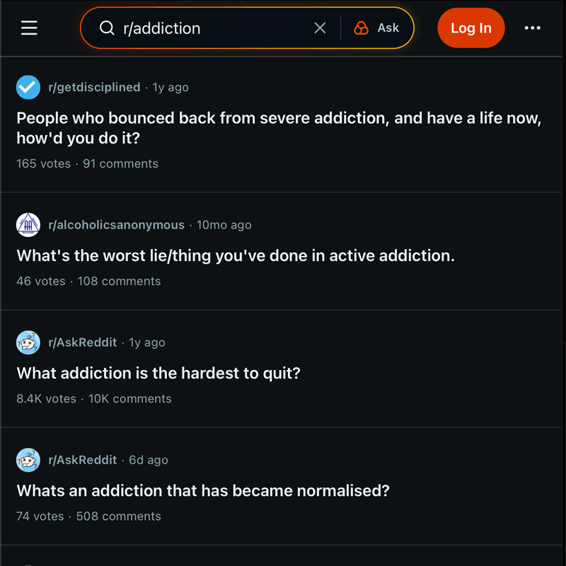 Reddit hosts online communities including those focused on recovery. Called subredits, examples of recovery groups include r/stopdrinking, r/alcoholism, r/addiction, r/sober, r/heroinrecovery, and r/opiatesrecovery. These forums provide practical advice and emotional support through posts, videos and comments. In the search box enter a topic such as “addiction recovery” or “sobriety” to see a list of subredit communities.